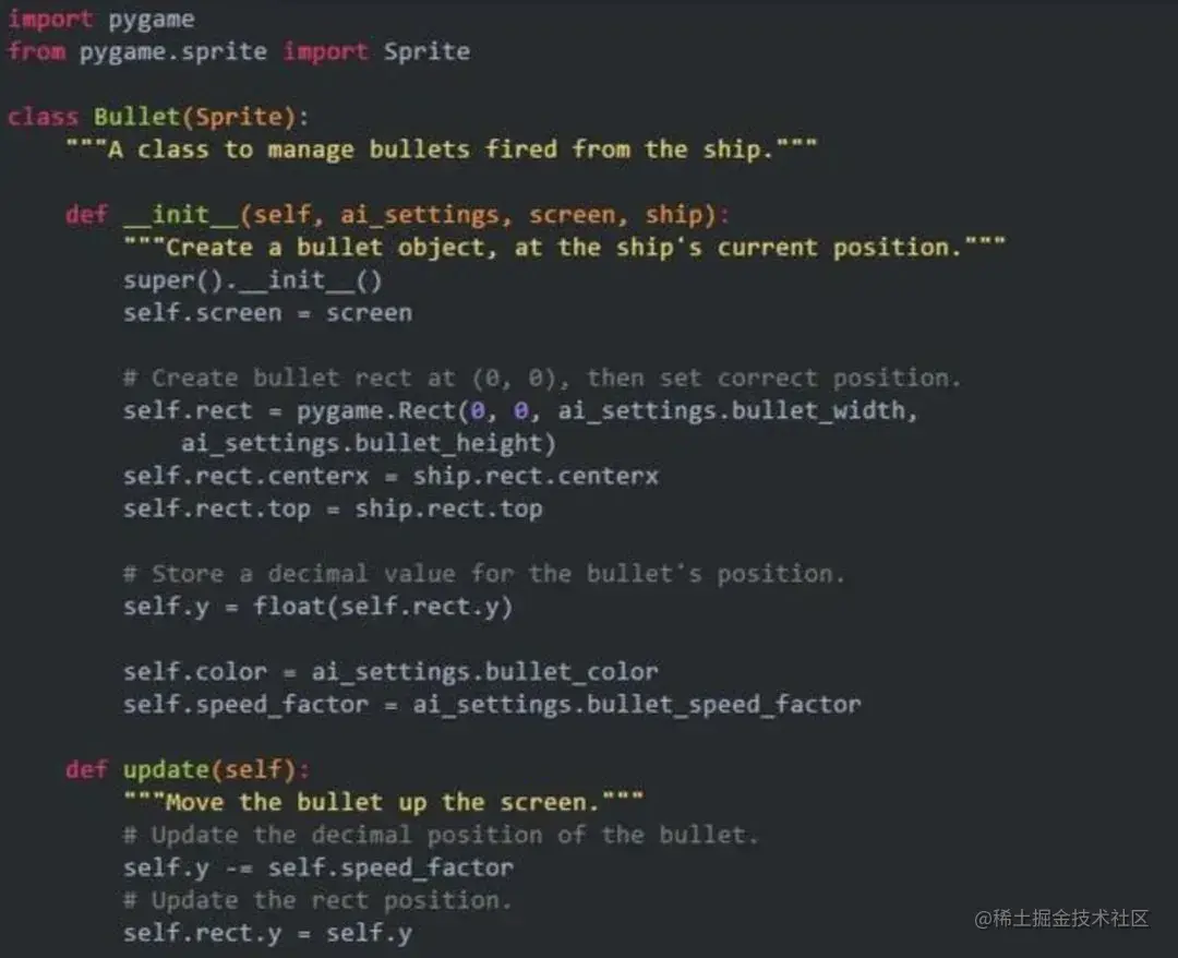 前面定义了Bullet类和必要的设置后,就可以编写代码了,在玩家每次按空格键时都会发射一发子弹。