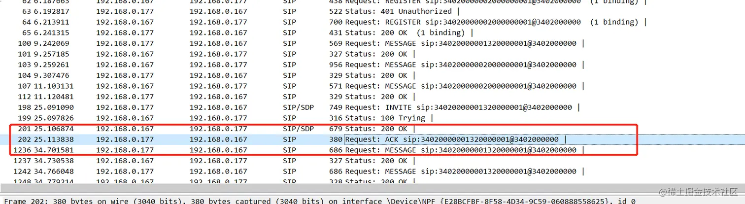 在上级抓包查看问题,显示的注册流程是正常的,但是在传输流的时候里面没有内容,表明下级没有传,这里我们可以看到上级发送的数据少了ACK请求,平台需要接收到ACK请求以后才会对上级平台发流,因此这里不发流是正常的。