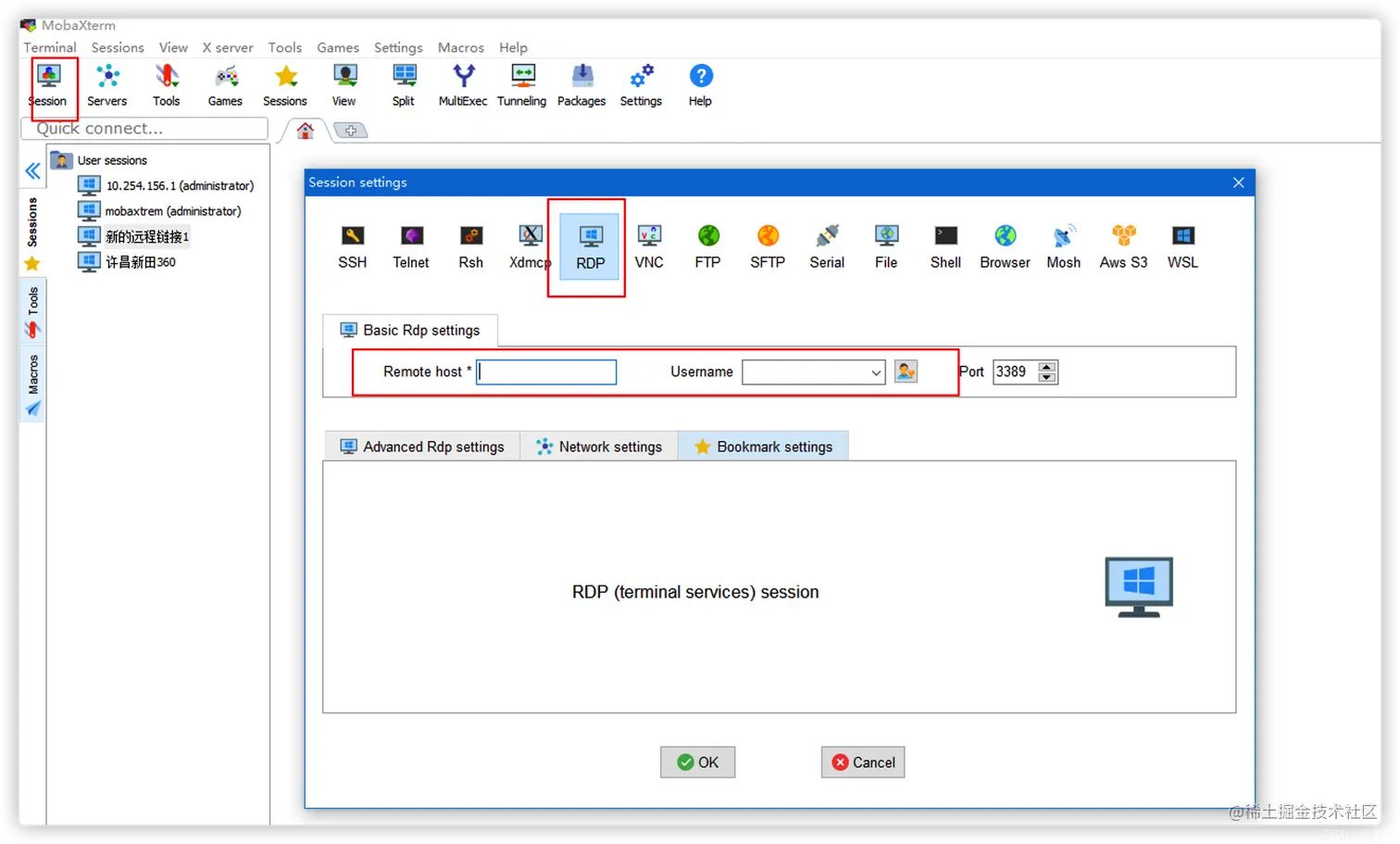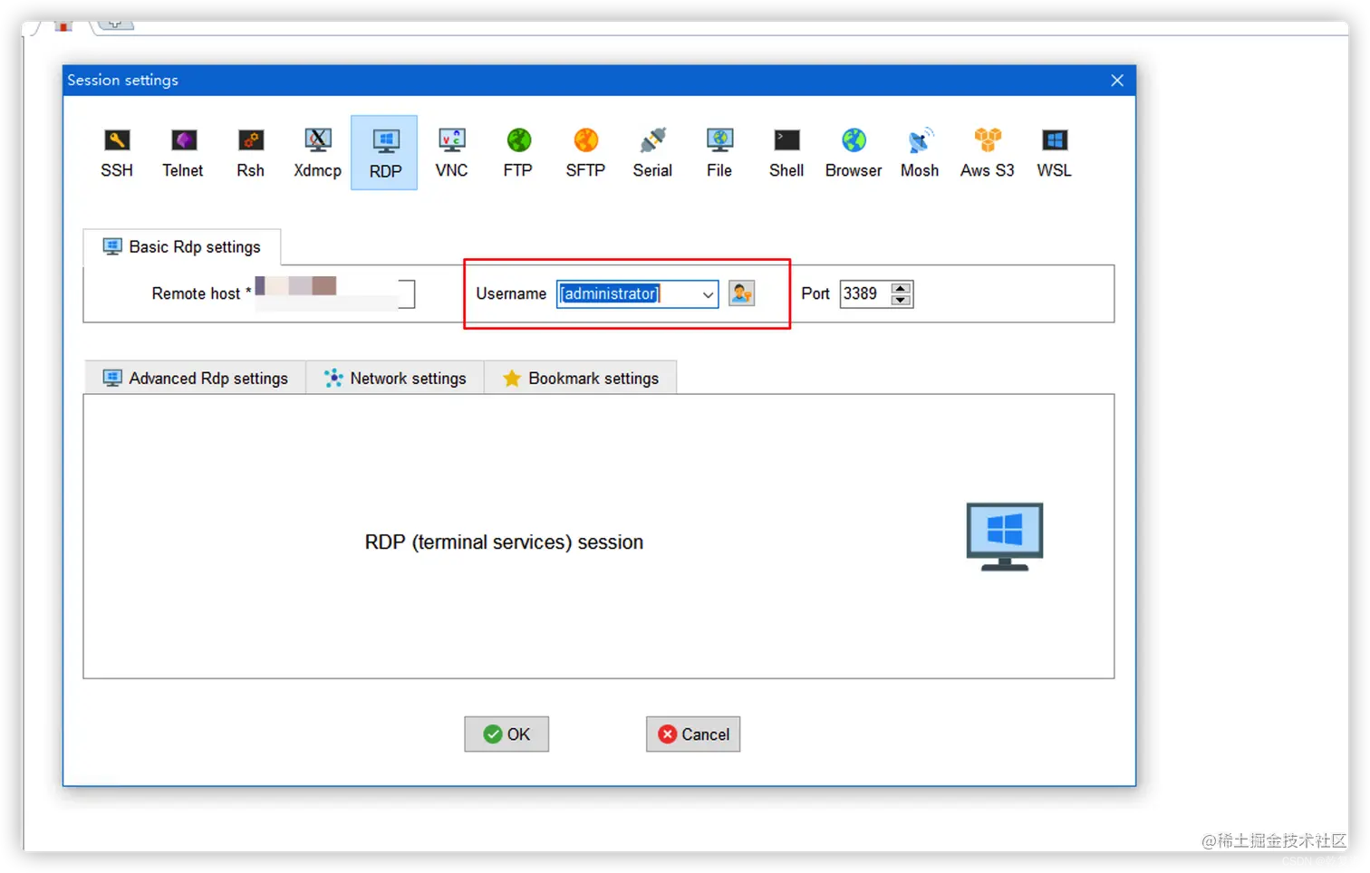 1.打开软件=>Session=>RDP=>填写remote host(ip)=>Username(电脑账号)