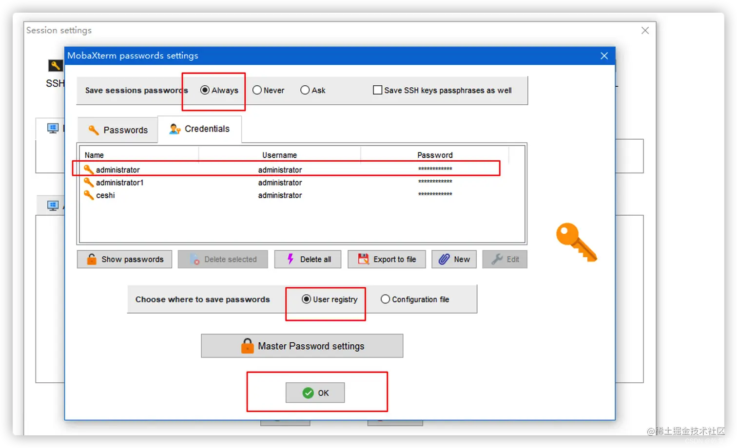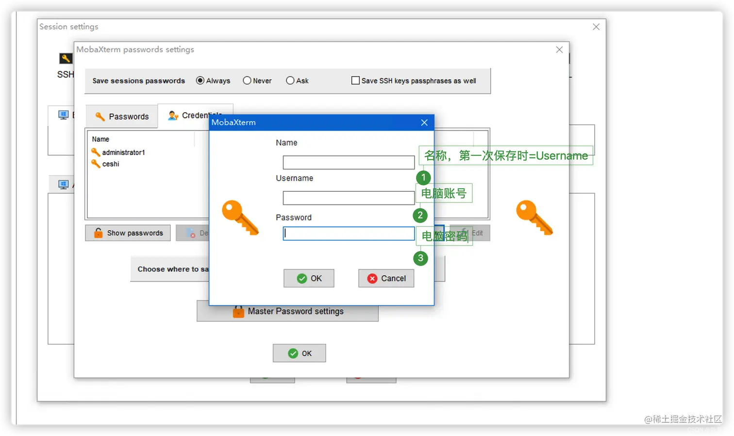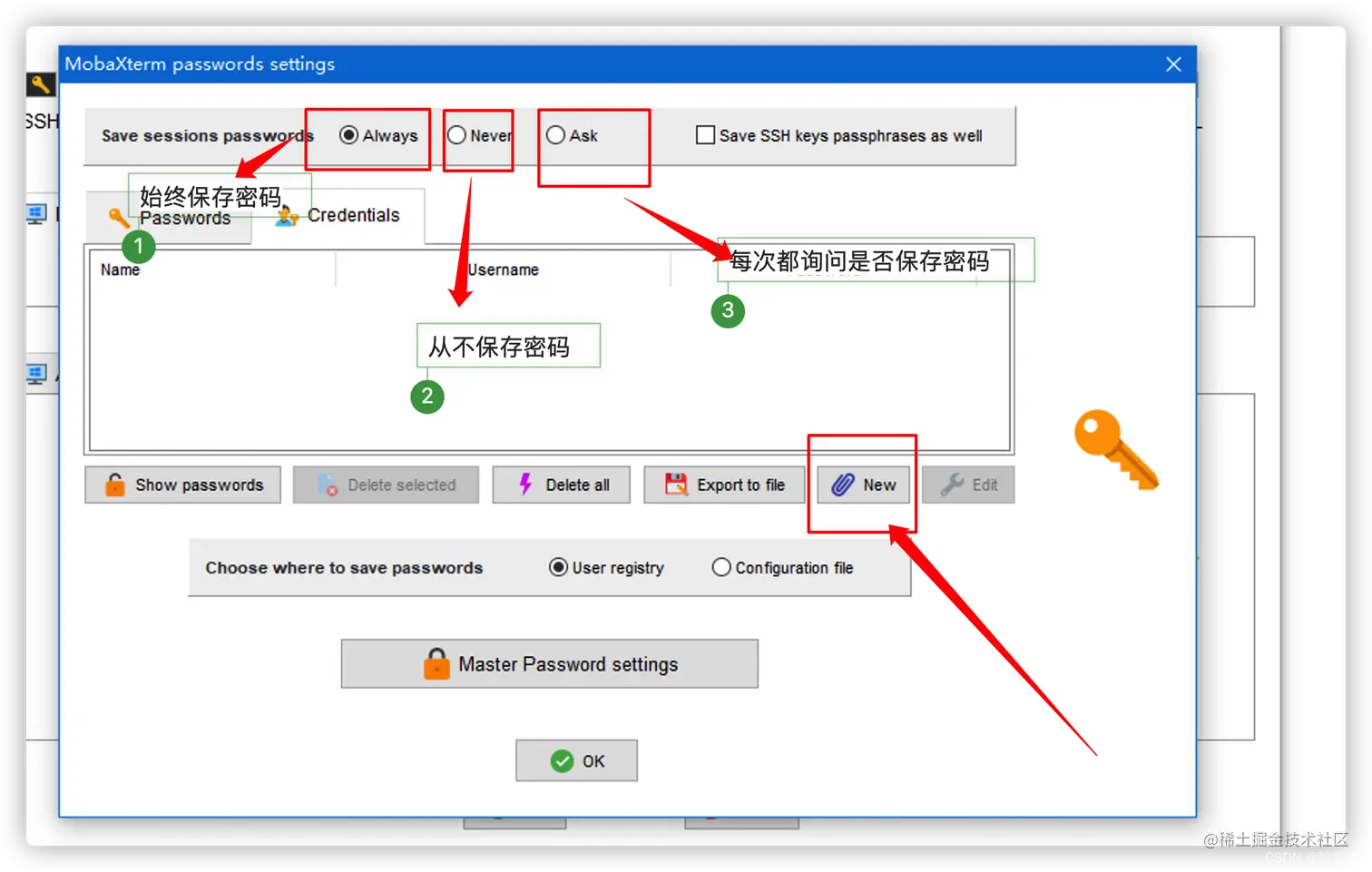 点击Username后的小人,Save session passwords =>Always;点击New,新增账号密码 ,第一次保存账号密码时,name=Username,后期可修改