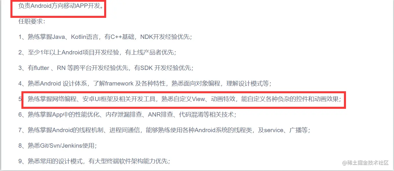 从这个招聘信息可以看到对于Android开发者而言熟悉高级UI是进阶Android高级工程师的必备技能之一。