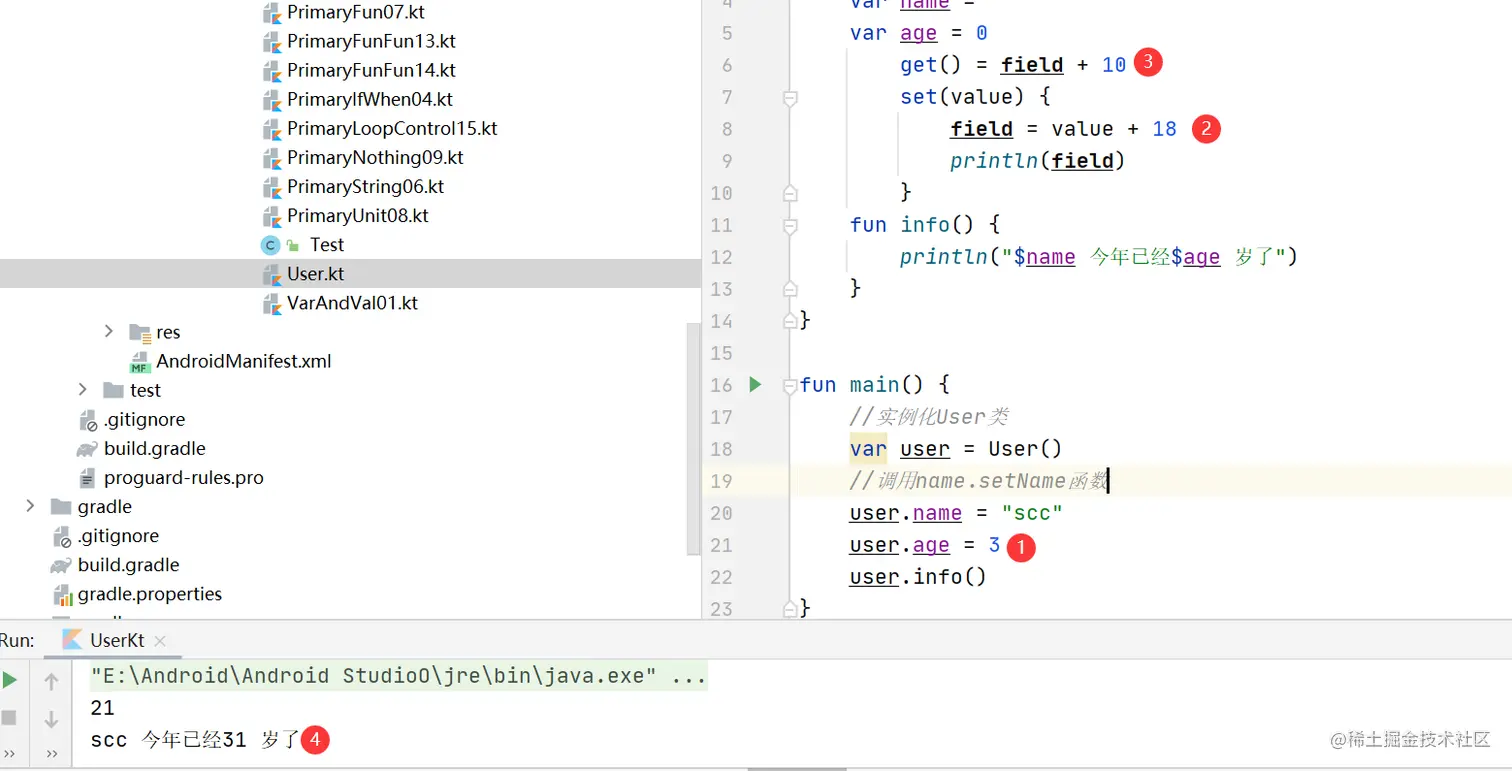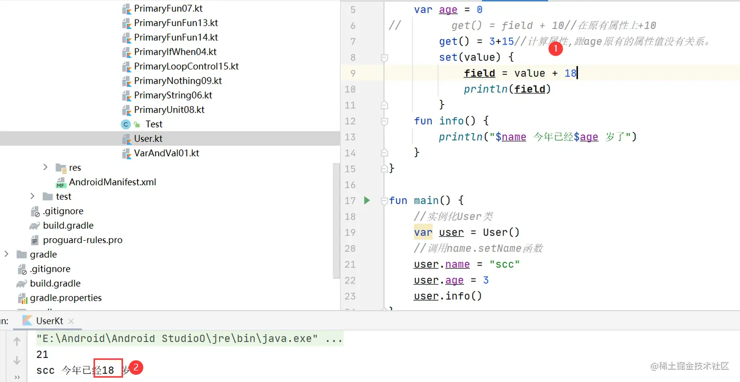 针对你定义的每一个属性,Kotlin都会产生一个field、一个getter、以及一个setter,field用来存储属性数据,你不能直接定义field,Kotlin会封装field,保护它里面的数据,只暴露给getter和setter使用。