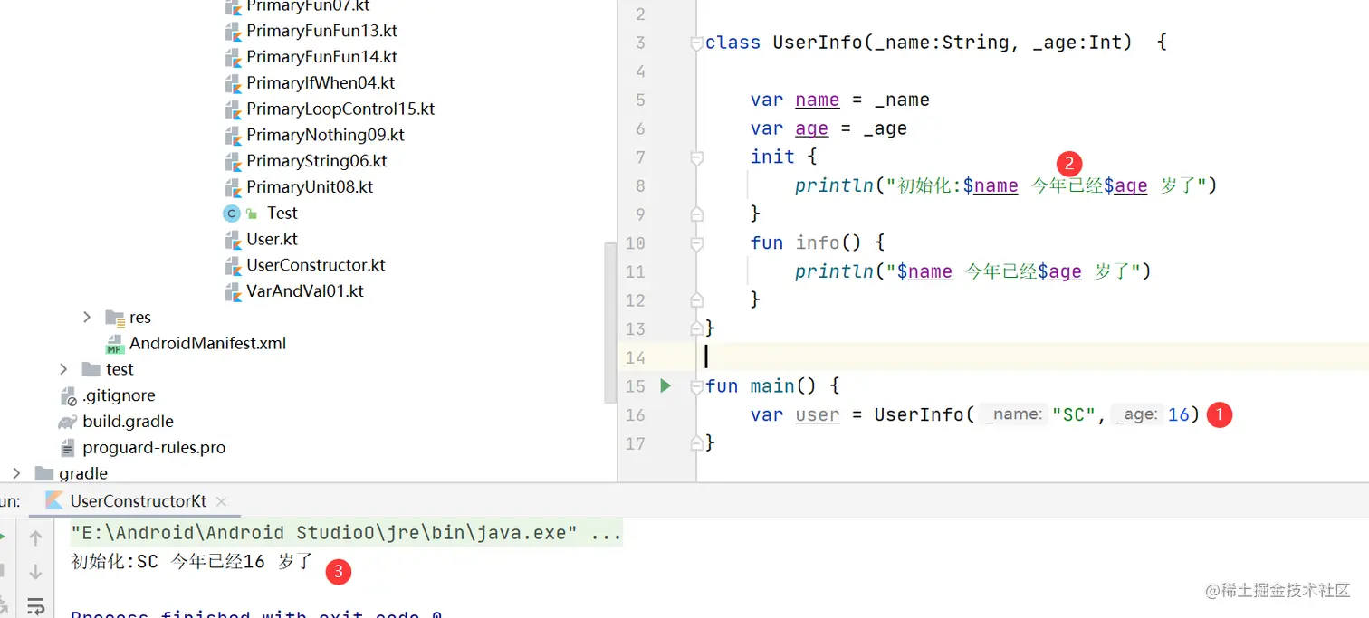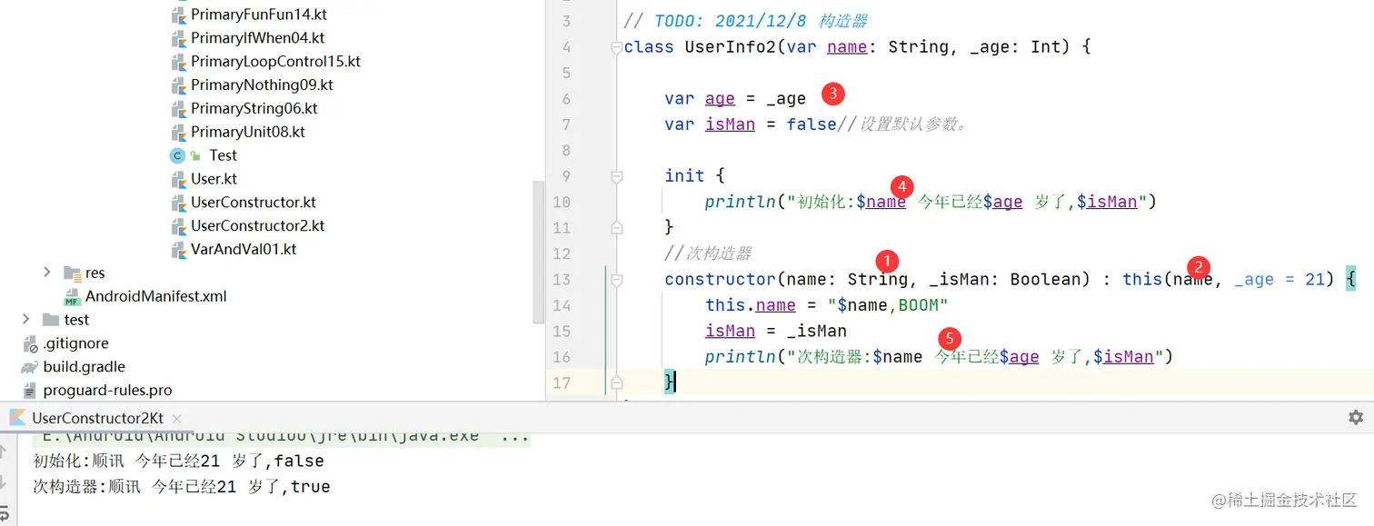 我们在UserInfo类的定义头中定义一个主构造函数,使用临时变量为UserInfo的各个属性提供初始值,在Kotlin中,为便于识别,临时变量(包括仅引用一次的参数),通常都会以下划线开头的名字命名。