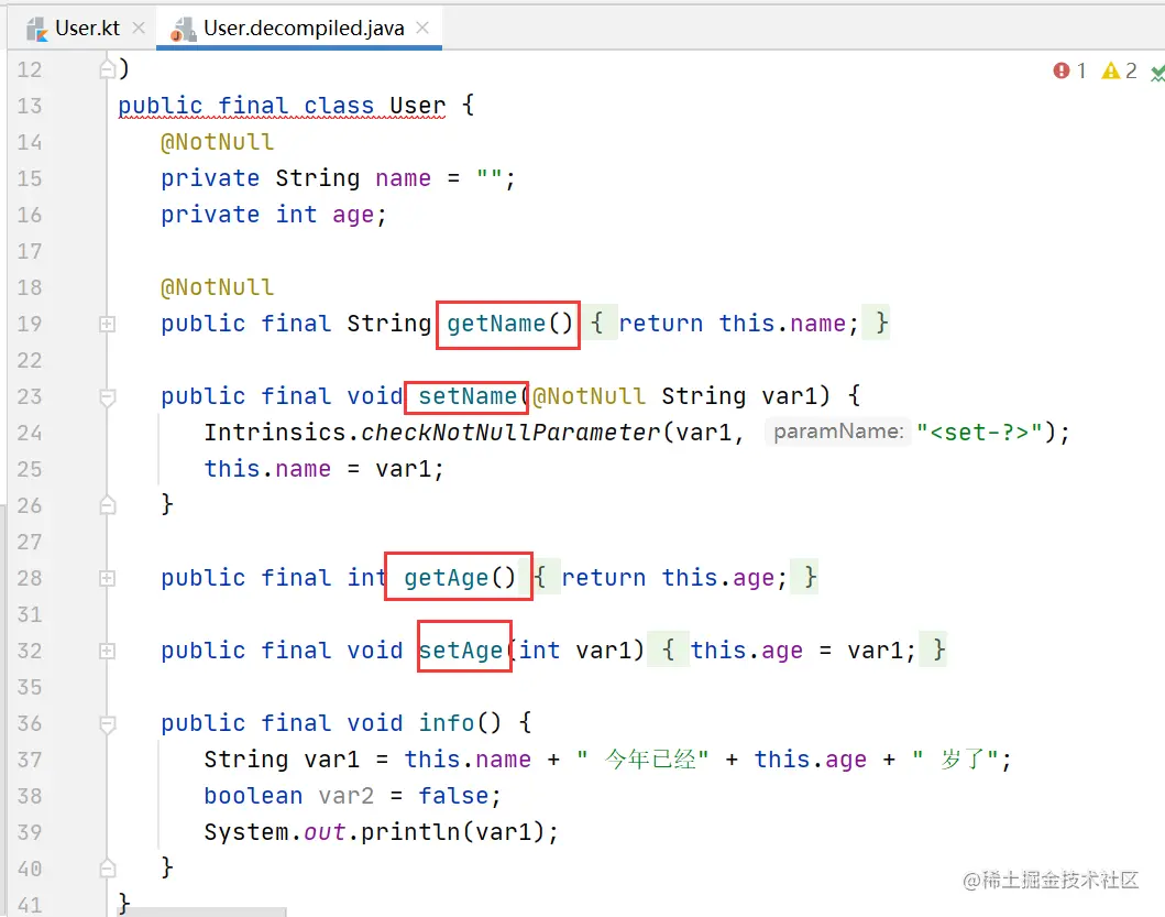 使用 var 关键字添加属性。如果使用 val 关键字,那么初始化之后就不能重新赋值了。同时,Kotlin自动生成了setter/getter函数。如下: