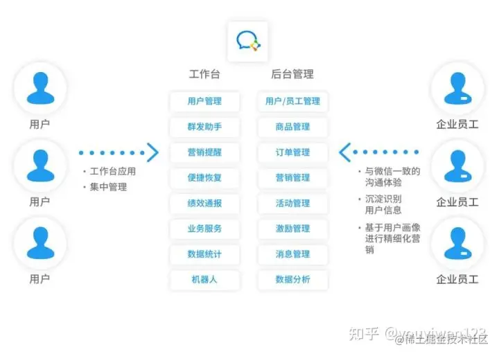 当用户数据引导至线上后,企微可以帮助企业进行资源合理调配,确保每位导购在触达用户的同时,也可利用工作台的工具进行营销、转化、促活等步骤。