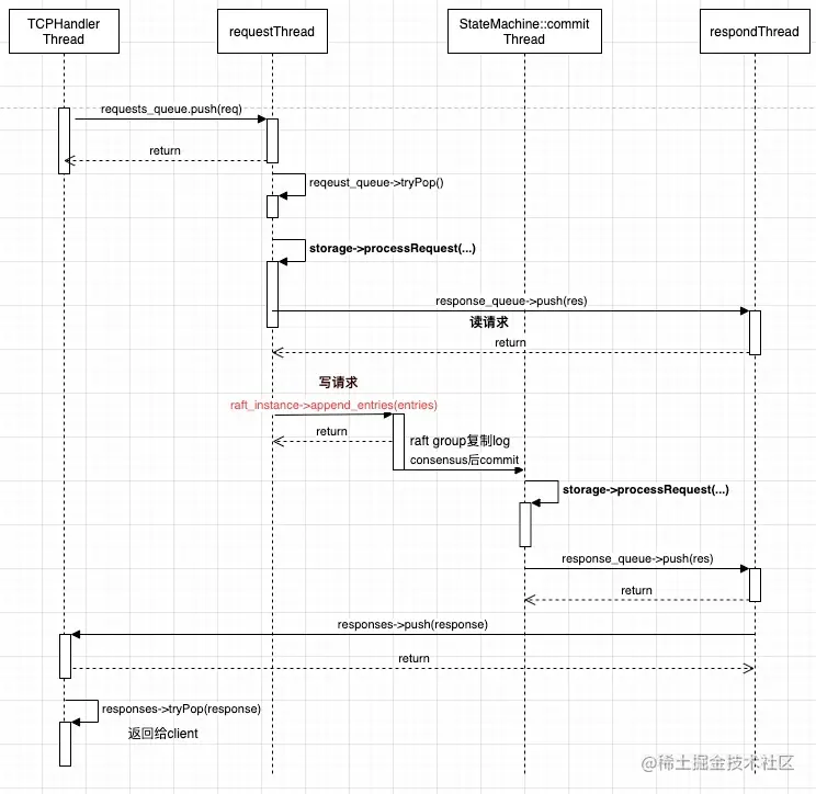 - 写请求通过 raft_instance->append_entries(entries) 这个 nuraft 库的 User API 进行 log 写入。达成 consensus 之后,通过 nuraft 库内部线程调用 commit 接口,执行 storage->processRequest(...) 接口。