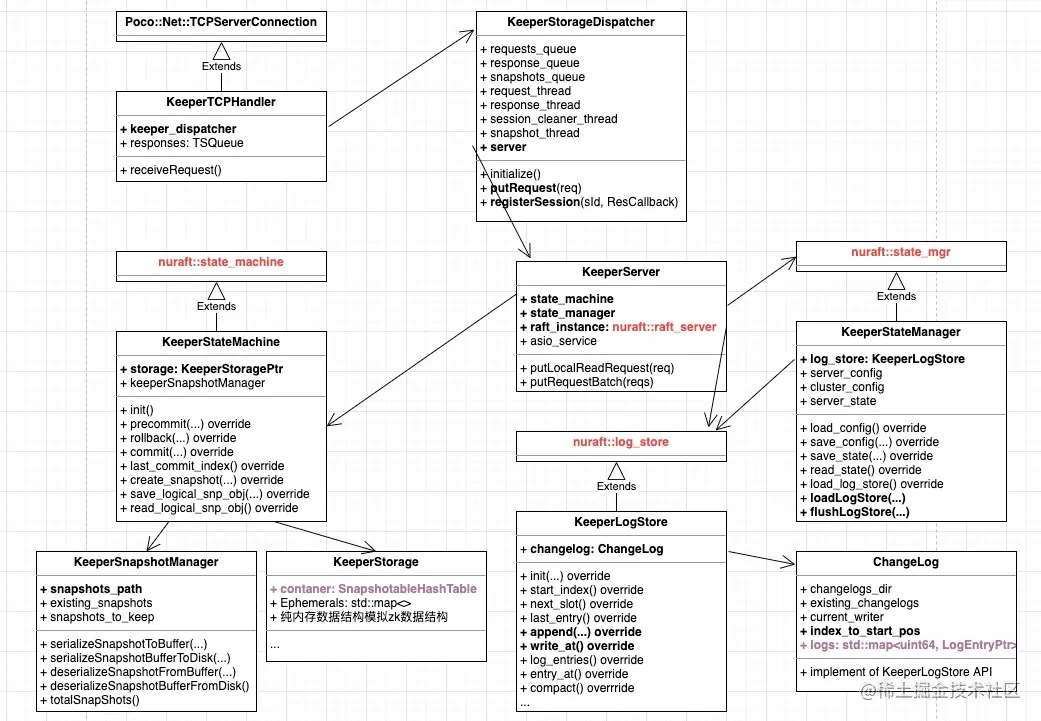 实例化 KeeperServer 对象,该对象是核心数据结构,是整个 Raft 的最重要部分。KeeperServer 主要由 state_machine,state_manager,raft_instance,log_store(间接)组合成,他们分别继承了 nuraft 库中的父类。一般来说,所有 raft based 应用均应该实现这几个类。