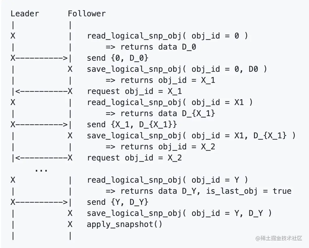 Nuraft 库中提供的 snapshot transmission:当新加入的 follower 节点或者 follower 节点的日志落后很多(已经落后于最新一次 log compaction upto_index),leader 会主动发起 InstallSnapshot 流程,如下图: