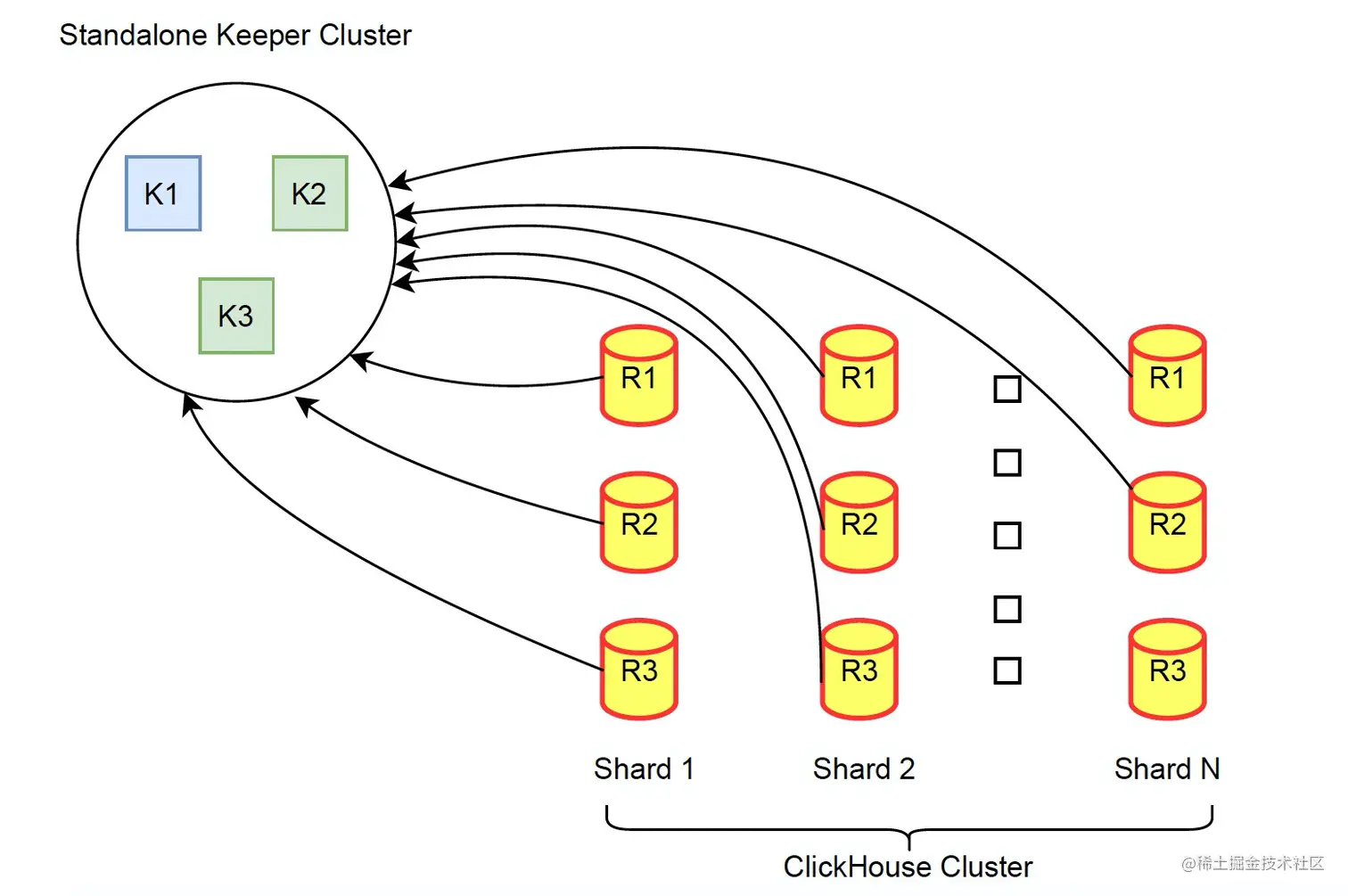 - 3种部署模式,推荐第一种 standalone 方式,可以选择小机型 SSD 磁盘,最大程度发挥 Keeper 的性能。