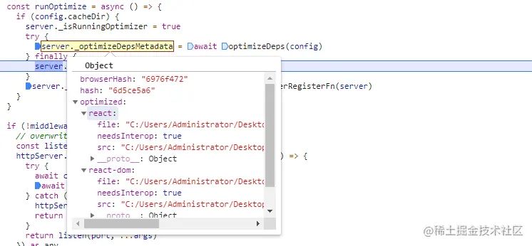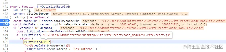 tryOptimizedResolve 会通过读取依赖构建阶段的缓存的依赖映射对象,拿到 react 对应的路径,并且加上对应得browerHash值。 没有依赖项得,会往路径前面加上/src