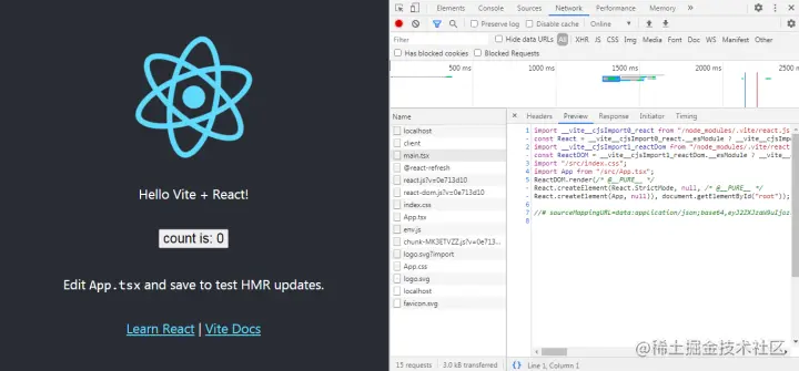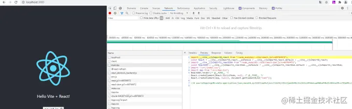 处理完请求内容所有import后,返回浏览器可以识别得部分,毕竟仅仅是react模块,浏览器识别不出来