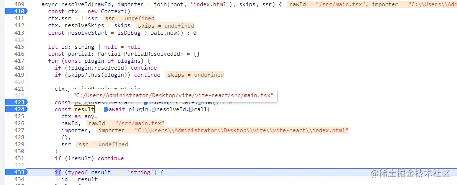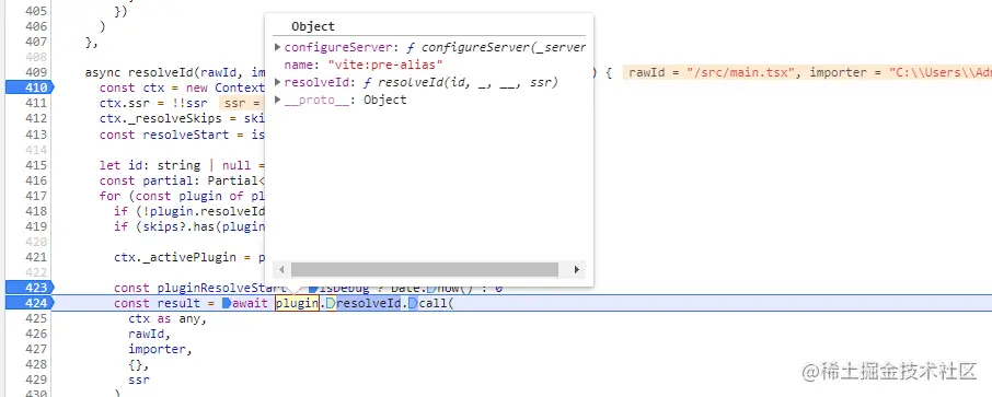 这里可以看出来resolveId方法通过两个 plugin:vite:pre-alias 及 vite:resolve,获取到了对应得文件路径