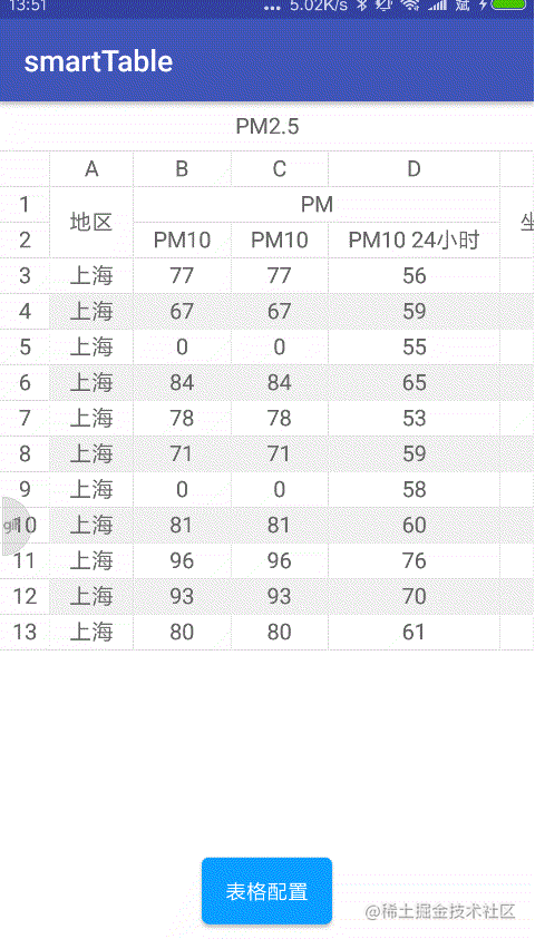 html的table,发现样式好看多了,按到这个思路,SmartTable增加了支持对单个格子的不同背景支持,在TableConfig里面有5个IBackgroundFormat样式,可以根据boolean isDraw(T t)返回数据做出判断是否绘制背景drawBackground,默认绘制整个背景,当然你可以自己定义IBackgroundFormat使用其他形状。