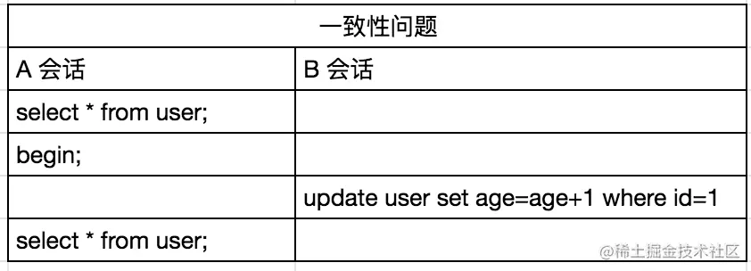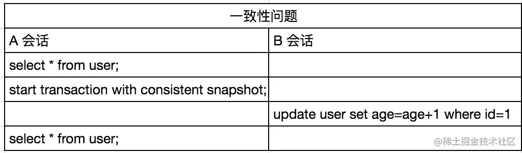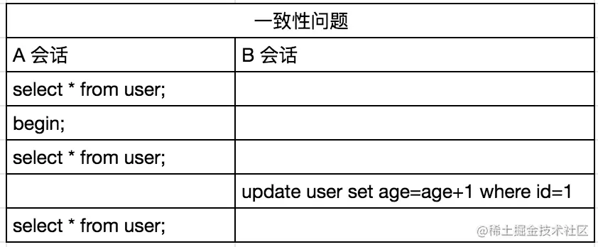 从这个角度来说,第一小节的案例似乎也没有问题,因为我们在 A 会话中执行 SELECT 语句多次,查到的结果也都是相同的,age 都是 102。