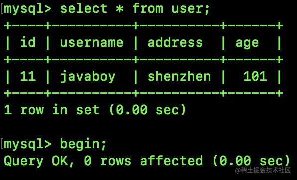 事实上,我们执行的 begin 语句并不是一个事务真正的起点。执行完 begin 之后,接下来执行的第一句 SQL,事务才真正启动。