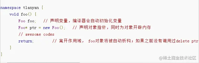 这是由于C++持有对象的方式造成的(或者说C++允许程序员手动控制内存引起)。Java/PHP等带有回收机制的语言,持有对象的方式是通过指针,程序员申请对象后会自动分配内存,系统负责跟踪和回收无用的对象和存在。C++允许开发人员以变量的方式持有对象,例如:Foo foo [= Foo(args)]。变量初始化后获得对象的引用,离开作用域后,系统销毁执行栈,对象自动被析构。C++也可以以指针的形式获得对象的引用: Foo* foo = new Foo(args)。这种方式分配的对象,需要开发人员手动管理。如果不执行delete,对象和分配的内存将一直存在,直到程序退出后,才由操作系统回收。如下代码可说明这点: