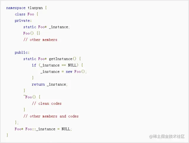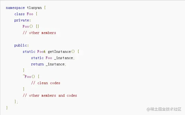 对比前一段代码,主要改动是移除了静态指针成员,改用函数内的静态成员。由于_instance是函数内的静态成员,在首次调用时被初始化(感谢无参构造函数),之后调用将略过初始化而执行后续代码;函数返回实例的引用,故而每次调用得到的是同一个对象,达到了单例的目的;程序执行结束后,实例的析构函数被自动调用,析构函数中的代码正确执行。