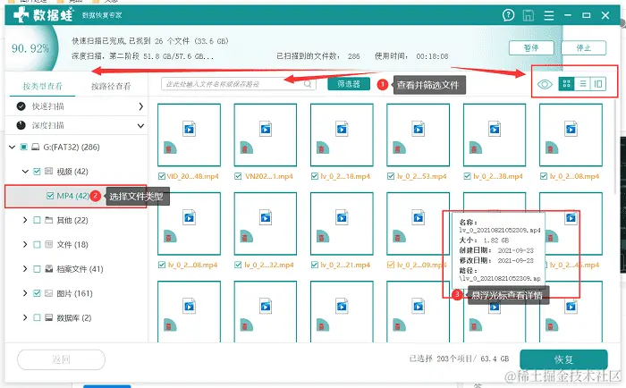 步骤二:进入快速扫描后,软件会扫描出很多内存卡丢失的文件。这个时候要如何筛选出视频文件呢?有三种方式可以查看并筛选文件: