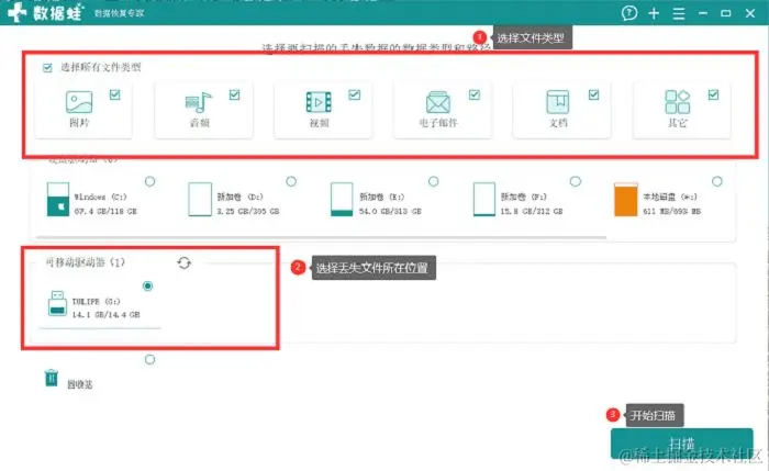 运行数据恢复软件,在首界面勾选和电脑连接的内存卡和相应的文件格式,在这里可以全选文件的格式,对丢失了视频文件的内存卡进行更加全面的扫描。