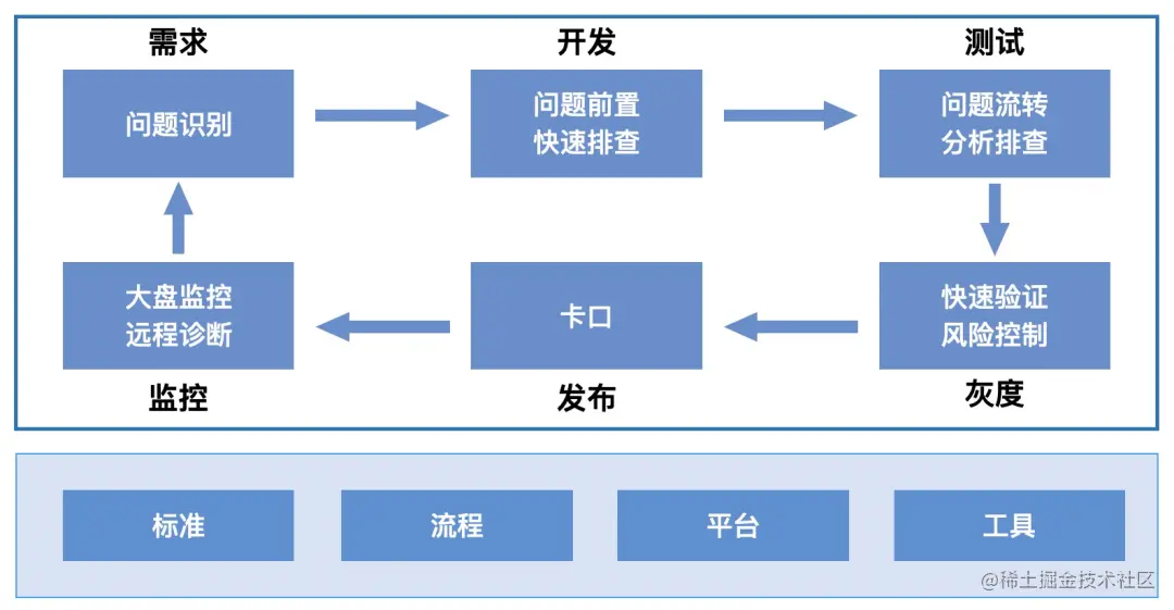 - 灰度和发布阶段关注线上数据大盘,建立报警机制,及时发现问题,通过用户日志排查线上问题。