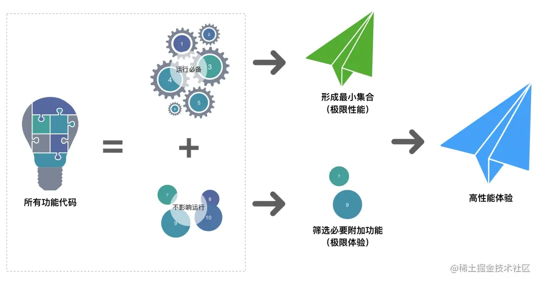最小集是一个探底的过程,在保证首屏产品形态不变形的情况下做出最小可运行,去掉其他所有跟首屏无关项,这就是减法。我们可以理解这个最小集是在不改变现有架构的情况下,我们最优的优化效果。如果最小集的极限数据达标,接下来就要在此基础上把必要的相关依赖项逐个加回来,保障产品功能完善,其他没必要的依赖性可以优化、或者去掉、或者延后等,这就是加法。当然如果这个最小集的极限数据都不能达标,那我们就需要从其他维度去寻找优化点了,一般能够从网络耗时和架构合理性两个方面找到突破点。