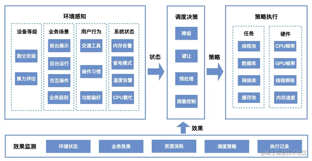 策略执行分为任务执行和硬件调优:其中任务执行,主要是通过内存缓存、数据库、线程池和网络库对相应任务的进行运行控制,来间接实现对各类资源的调度控制;而硬件调优,则是通过与系统厂商合作,直接对硬件资源进行控制;如CPU密集的高优业务开始运行时,将提高CPU频率,并将其运行线程绑定到大核上,避免线程来回切换损耗性能,最大化地调度系统资源来提升性能