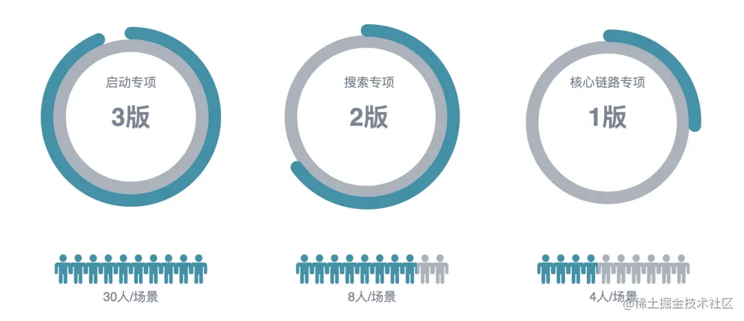 启动专项是第一个性能专题项目,完成了一个场景优化,耗费30人,3个版本迭代。之所以人力比较多,是因为“第一次”面临的问题非常多,指标要分析定义标准、埋点工具要新建、优化过程没经验、管控手段要新建。
