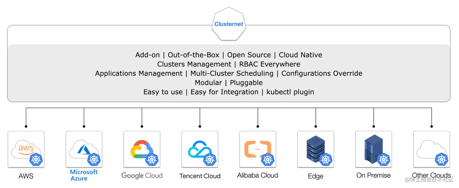 Clusternet ( Cluster Internet ) 由腾讯联合多点生活、QQ音乐、富途证券、微众银行、酷狗音乐、三七互娱等共同发起,专注 K8s 多集群管理和应用治理方向,希望让管理多集群就像上网一样简单。