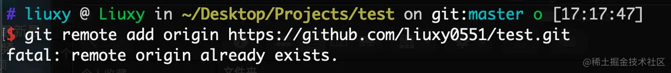 如果出现问题:fatal: remote origin already exists,提示 origin 已存在,执行 git remote rm origin 删除别名再重复第 5 步即可: