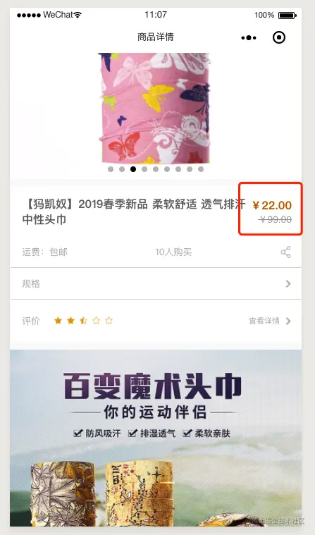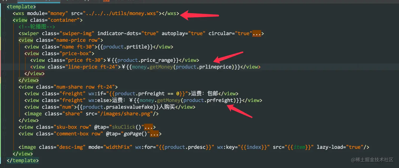 在 template 中引入 money.wxs 文件,并传入数据进行转换,页面代码可参考 detail.wpy