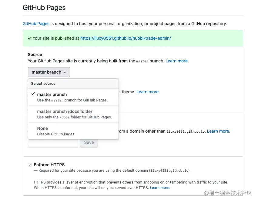 docs这个文件夹,在 Setting -> Github Pages -> Source 中是无法选择 master branch / docs folder 的,这个时候可以把 dist 文件夹下的文件放到项目根目录,然后在 Setting -> Github Pages -> Source 中选择第一项 master branch,点击给出的 url 就可以查看静态页面了。不推荐,因为每次打包都需要移动文件,或者 dist/index.html 会和根目录的 index.html 冲突。