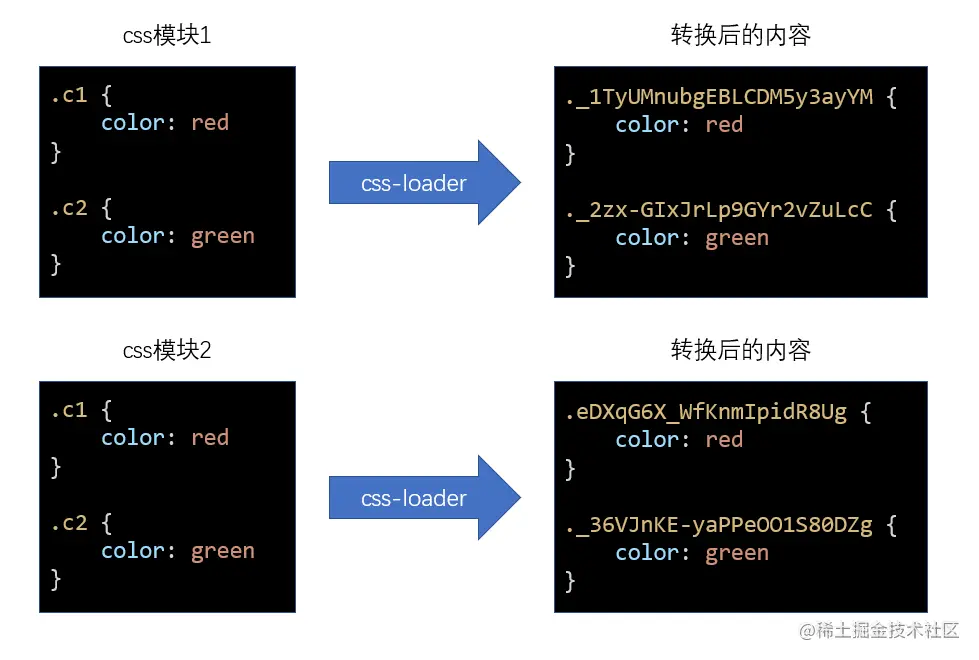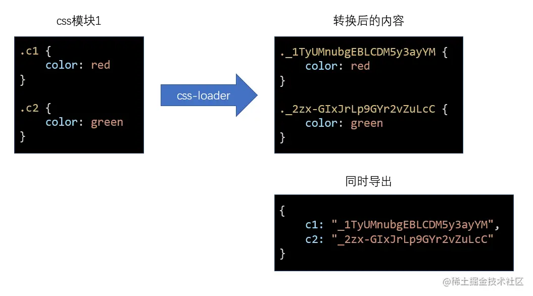 为了解决这个问题,css-loader会导出原类名和最终类名的对应关系,该关系是通过一个对象描述的