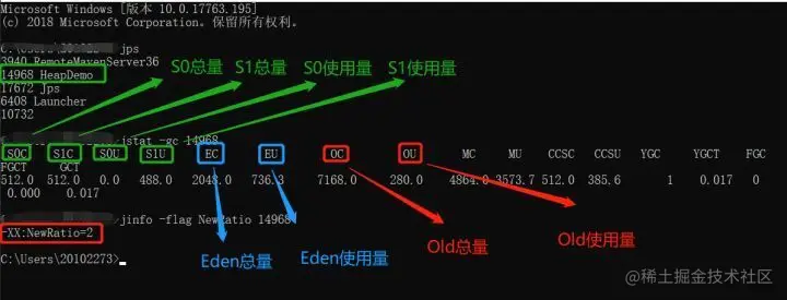 以上边的代码为例:设置启动参数-XX:+PrintGCDetails;可在cmd窗口中输入jps查询进程号,然后通过jstat -gc 进程id指令查看进程的内存使用情况。