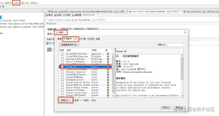 JDK自带内存分析的工具:在已安装JDK的bin目录下找到jvisualvm.exe。打开该软件,下载插件Visual GC,一定要点击检查最新版本,否则会导致安装失败。