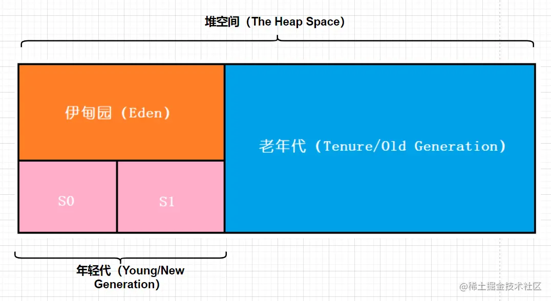 如图所示,堆区又分为年轻代(YoungGen)和老年代(OldGen);其中年轻代又分为伊甸园区(Eden)和幸存者区(Survivor);幸存者区分为幸存者0区(Survivor0,S0)和幸存者1区(Survivor1,S1),有时也叫from区和to区。