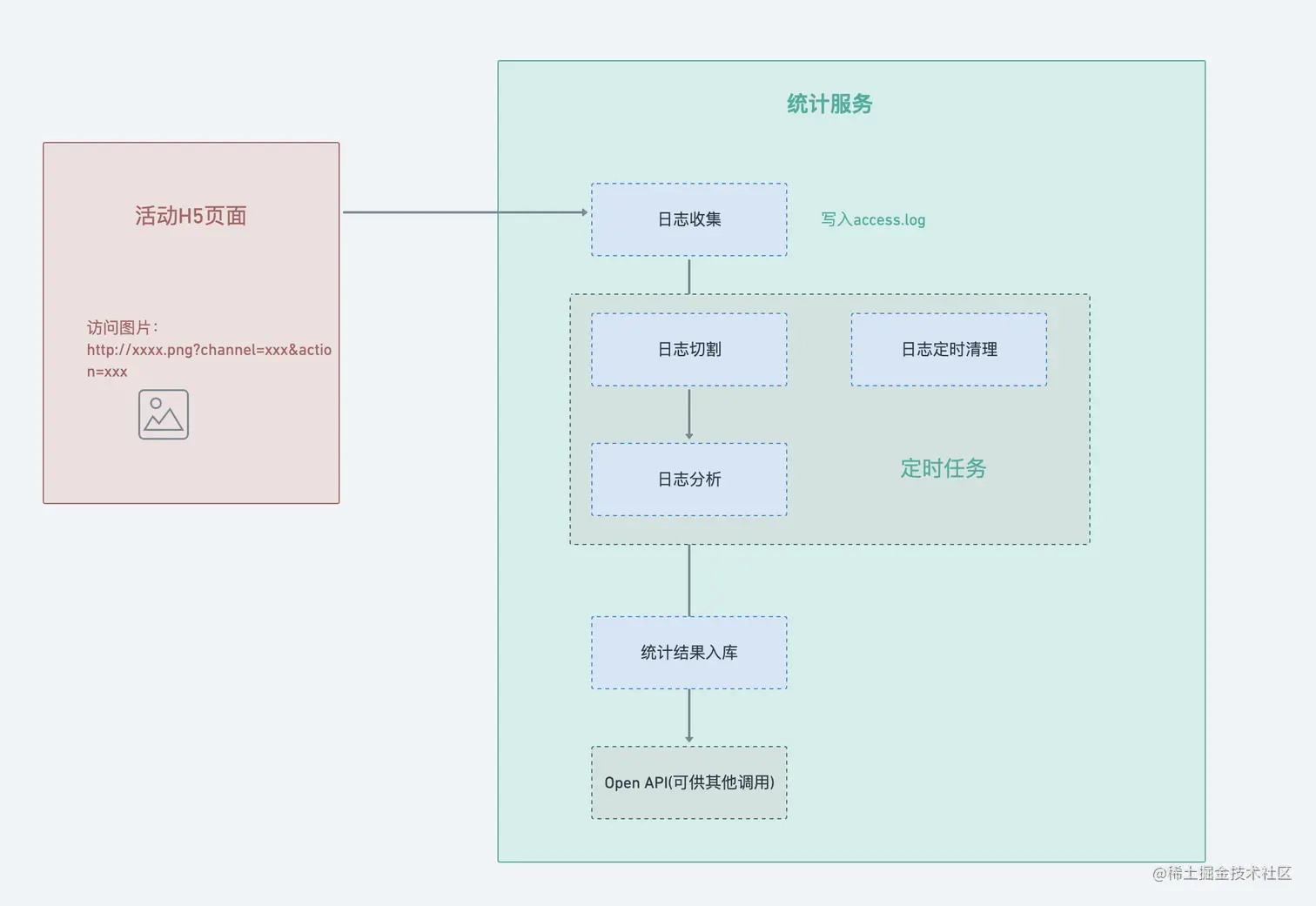 今天就来说一下其中的统计服务:目的主要是为了实现 H5 页面的分渠道统计(其实不仅仅是分渠道统计,核心是想做一个自定义事件统计服务,只是目前有分渠道统计的需求),查看每个渠道具体的 PV 情况。(具体会在 url 上面体现,会带上页面名称、id、渠道类型等)