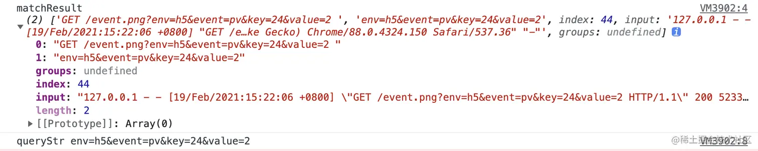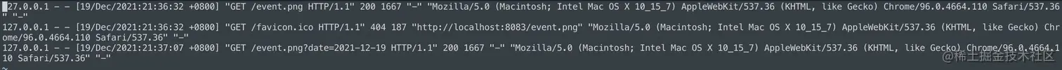 127.0.0.1 - - [19/Feb/2021:15:22:06 +0800] "GET /event.png?env=h5&event=pv&key=24&value=2 HTTP/1.1" 200 5233 "-" "Mozilla/5.0 (Macintosh; Intel Mac OS X 11_0_1) AppleWebKit/537.36 (KHTML, like Gecko) Chrome/88.0.4324.150 Safari/537.36" "-"