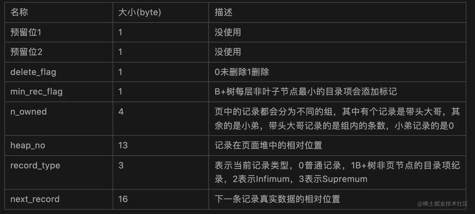 看到这里大家是否有疑问,为啥记录头会有这个属性。原因是因为如果直接物理删除掉后,需要在磁盘重新排序其他记录,会造成性能消耗,所以打个标记来避免。所有被删除的记录会形成一个垃圾链表,记录的空间叫可重用空间,如果有新记录插入,直接复用被删除记录的空间。(至于何时刷新,后续后讲解)