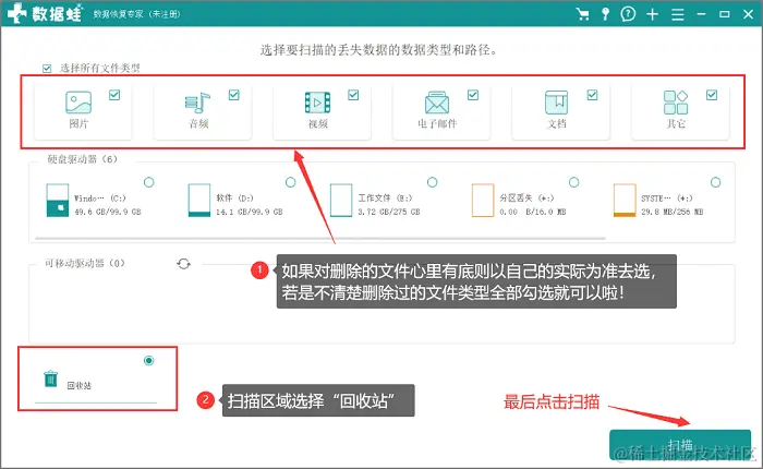 步骤3:进入主页界面,第一个部分即是扫描的文件类型,文件类型的话第一次体验的小伙伴建议雨露均沾哦!当然本文的主题是ppt,那么只勾选“文件”这项也可以,第二部分是扫描的位置,我们可以选择回收站,同时也可以选择ppt删除前的存放位置,选择完成后点击“扫描”开始等待;