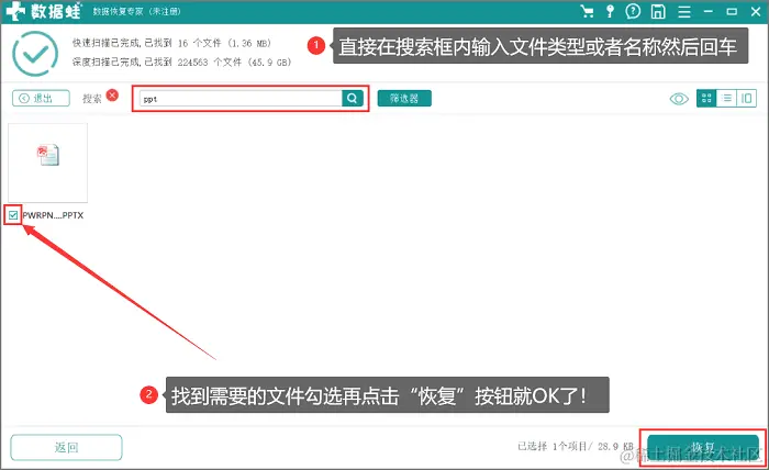 5.扫描完成了,如果你没有浏览到需要恢复的文件,我们可以在上面的搜索框内输入“ppt”回车,找到需要恢复的ppt文件勾选它点击恢复即可!