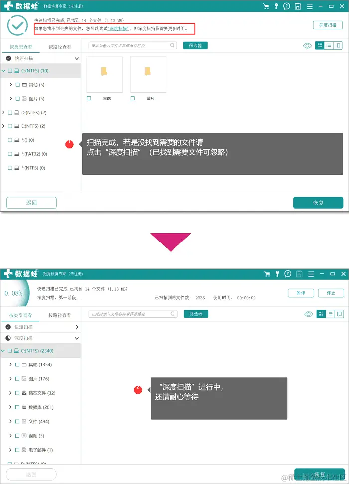 步骤4:扫描完成,近段时间的文件已经被揪出来了,其实会发现还有好多文件没看到,为什么?因为刚刚是快速扫描,扫描的时间段会就近扫描,如果没有找到需要的文件可以尝试“深度扫描”,该扫描模式会比较“挑刺”,所以用时会稍微长一点,当然文件的数量也会决定用时长短;: