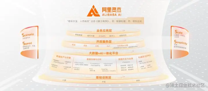 我们可以把灵杰理解为四层产品的有机组合。它的最底层是基于云基础设施,比如像计算、存储、网络等等这一些我们耳熟能详的基础产品。和以前不同的是,我们并不需要思考,从资源视角怎么样搭一个集群、加一堆GPU、或者装一个硬盘。今天我们可以从需求视角来考虑,需要多大存储、怎样的异构计算、怎样通过云原生容器化等等方式把资源简单地链接起来。这是最底层基础设施给我们提供的简单化、便捷化的能力。