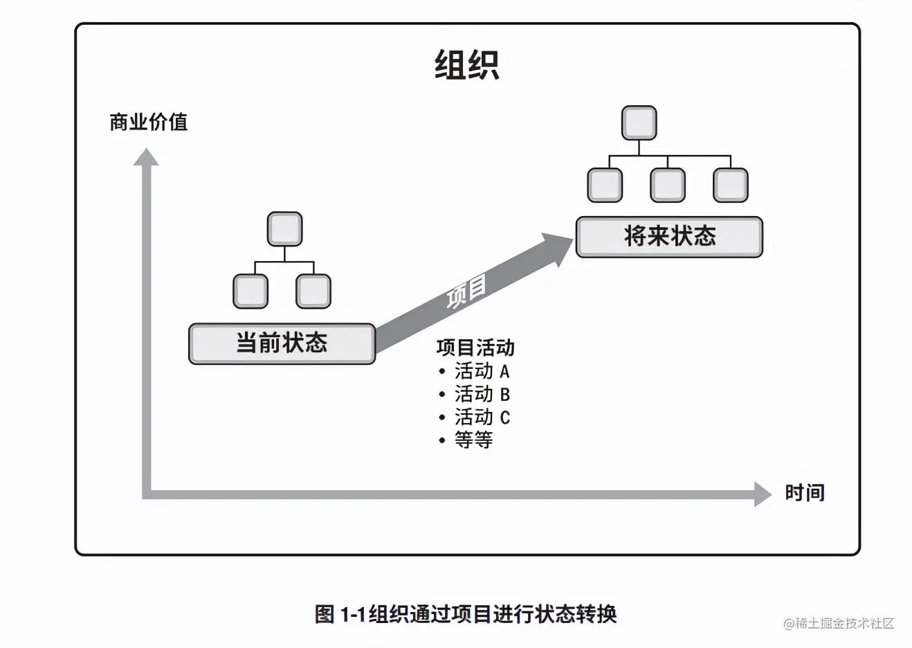 《PMBOK® 指南》中指的是项目驱动变更,项目是实现组织变更的唯一手段。大项目实现大变革,小项目实现小变革。从商业角度来看,项目已在推动组织从一个状态转到另一个状态,从而达成特定目标。