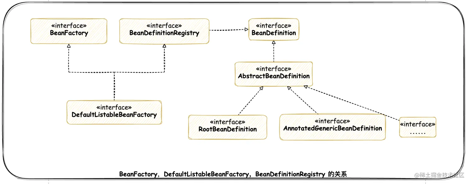 BeanFactory 只是一个接口,我们最终需要一个该接口的实现来进行实际的Bean的管理,DefaultListableBeanFactory 就是这么一个比较通用的 BeanFactory 实现类。DefaultListableBeanFactory 除了间接地实现了 BeanFactory 接口,还实现了 BeanDefinitionRegistry 接口,该接口才是在 BeanFactory 的实现中担当 Bean 注册管理的角色。