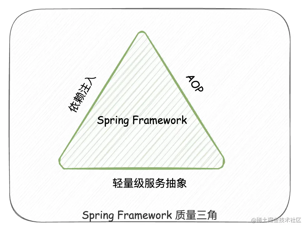 我们都知道,Spring 的两大核心就是 IoC 和 AOP ,其他功能都是在此基础上衍生而来。我们通常认为,Spring IoC 容器, Spring AOP,以及 Spring 对其它 JavaEE 服务的集成共同组成了 Spring 框架的 "质量三角"。