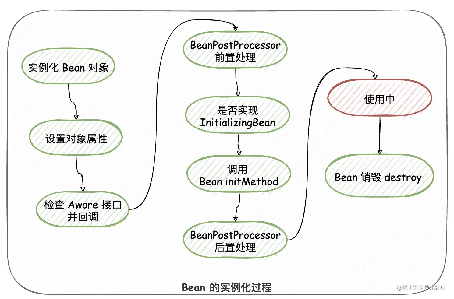 Spring 容器会对其所管理的对象基于统一的生命周期管理。这些Bean 完全摆脱了那种 “new 完之后被使用,脱离作用域后即被回收的命运”。Bean 的实例化过程如下图: