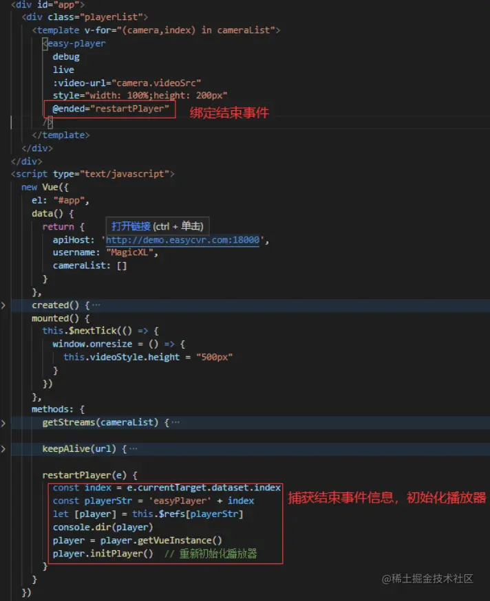 这里我们需要绑定播放器事假,并处理捕获事件即可,代码如下: