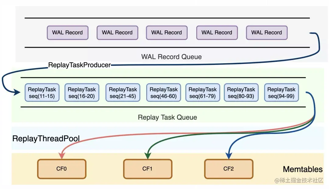 一写多读架构下,为了保证同一数据库实例的Primary、Replica、Standby三个角色的内存镜像完全一致,新增了一种SwitchMemtableLog,该Log Record在RW的switch_memtable过程中产生,因此RO、Standby不再主动触发switch_memtable操作,而是通过从RW上同步SwitchMemtableLog进行switch_memtable。SwitchMemtable操作是一个全局的屏障点,以防止当前可写memtable在插入过程中switch从而导致数据错乱。另外,对于2PC事务,并发控制也需要做适配。一个2PC事务除了数据本身的日志,还包括BeginPrepare、EndPrepare、Commit、Rollback四类日志,写入过程中保证BeginPrepare和EndPrepare写入到一个WriteBatch中并顺序落盘,因此可以保证同一个事务的Prepare日志都会被解析到一个ReplayTask中。在并行回放过程中,由于无法保证Commit或Rollback日志一定后于Prepare日志被回放,因此如果Commit、Rollback日志先于Prepare日志被回放,那么在全局的recovered_transaction_map中插入一个key对xid的空事务,对应的事务状态为Commit或Rollback;随后Prepare日志完成回放时,如果发现recovered_transaction_map中已经存在对应的事务,那么可以根据事务的状态来决定直接提交事务还是丢弃事务。