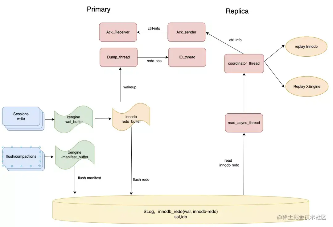在InnoDB中有redo和undo两种日志,undo日志可以理解为一种特殊的“data”,所以实际上InnoDB的所有操作都能通过redo日志来保证持久性。因此,在进行复制时,只需要在主从节点复制redo日志即可。X-Engine引擎包含两种日志,一种是wal日志(WriteAheadLog),用于记录前台的事务的操作;另一种是Slog(StorageLog),用于记录LSM-tree形状变化的操作,主要指Compaction/Flush等。wal日志保证了前台事务的原子性和持久性,Slog则保证了X-Engine内部LSM-tree形状变化的原子性和持久性,这两个日志缺一不可,都需要复制同步。