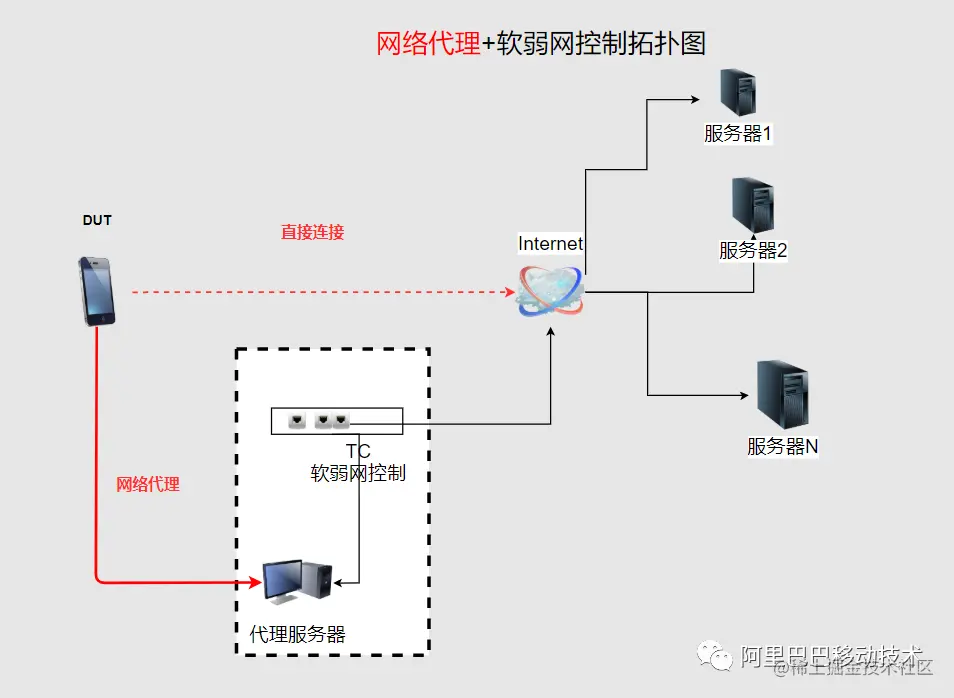 为了可以让每个用户很方便的使用弱网平台,经多次评估及讨论最终采用网络代理的方式,进行网络流量的拦截和控制,这样的好处是有较强的通用性,无论是Android 还是iOS以及windows系统均自带网络代理功能,因此用户侧直接在各端设置网络代理并免安装应用即可直接使用,具体的网络拓扑图如下: